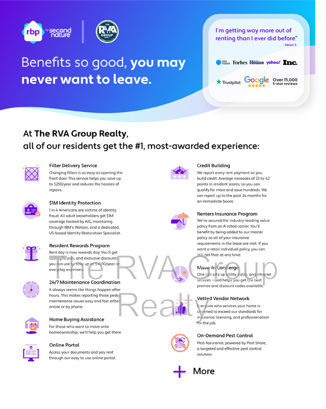 All The RVA Group Realty residents are enrolled in the Resident Benefits Package (RBP) for $55.95/month which includes liability insurance, credit building to help boost the resident's credit score with timely rent payments, up to $1M Identity Theft Protection, HVAC air filter delivery (for applicable properties), move-in concierge service making utility connection and home service setup a breeze during your move-in, our best-in-class resident rewards program, on-demand pest control, and much more! More details upon application.